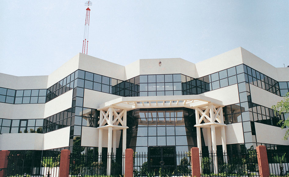 The extensively landscaped site of GlobeSpan Technologies, with fountains in front and a recreation space at the rear, is located in an area surrounded by office buildings. However, what makes it different are the folding facets/edges of the building, which not only help prevent overlap between the different rooms, but the staggered design also enables the rooms to welcome natural light. The interiors are designed as a selfsufficient environment equipped with a multitude of facilities, other than 200 workstations and electronic texting labs, like a cafeteria, a gymnasium, a crèche, an ATM and other office infrastructural facilities. The centrally air-conditioned enclosure has been provided with an efficient building service system that maintains healthy and comfortable indoor conditions with ambient temperature, light and oxygen levels.